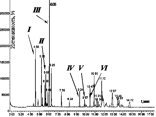 Взаимодействие НБД с АФ приводит к образованию разнообразных соединений количественно превышающих число продуктов аллилирования НБД другими аллиловыми эфирами. Типичная хроматограмма реакционного раствора приведена в пункте 2.5.