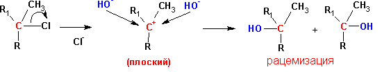 Аналогичные выводы были сделаны при сравнении скоростей рацемизации и обмена галогена в оптически активных галогенпроизводных (поскольку исходное и конечное соединение идентичны, для изучения скорости процесса использовали радиоактивные галоген-ионы).