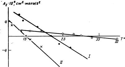 Ранее нами было найдено [7], что для полимера I 6-растворителем служит ТГФ (9=22°). Предварительные опыты по температурному осаждению полимеров из раствора показали, что ТГФ можно использовать в качестве О-растворнтеля и для полимера II. Оказалось, что при повышении температуры >20° растворы становились мутными, поэтому 9-температуру искали в температурном диапазоне <20°. Полимер III в ТГФ не растворился. При комнатной температуре этот полимер хорошо растворился в ДХ, а при повышении температуры >45° полимер выпадал в осадок, что свидетельствовало о наличии НКТС. 0-температуры для всех полимеров находили экстраполяцией температурных зависимостей Л2 к 0, используя растворы нефракционированных образцов и фракций.