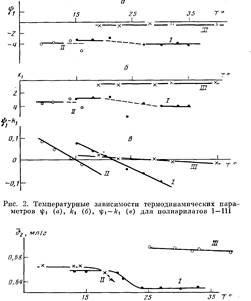 На рис. 2 представлены температурные зависимости параметров гр±, А-ч и разности г|)1—к,. Полученные данные показали, что процесс растворения всех трех полимеров протекает экзотермически (Ач<0) и сопровождается возникновением ориентации молекул растворителя около молекул полимера (i|)i<0). Нужно учесть, что донорно-акцепторные связи указанного выше типа не относятся к числу слабых. В области, близкой к 6-темпера-туре, наблюдается разброс экспериментальных значений и kt как для нефракционированных образцов I и II (рис. 2), так и для фракций. Для всех трех систем характерно уменьшение разности к С) с ростом температуры, что отражает ухудшение термодинамического качества растворителя при нагревании. На рис. 2, а, б обращает на себя внимание следующий факт: в области температур ниже 8 значения ifi и kiдля всех систем остаются практически постоянными, причем для полимера III это постоянство сохраняется во всей исследованной температурной области.