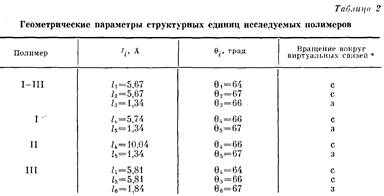 Следующей задачей нашего исследования было выяснение влияния изменения строения элементарного звена полимера на конформации макромолекул в растворе. Вначале методом машинного эксперимента на ЭВМ проведено моделирование макромолекулярного клубка методом Монте-Карло по программе, описанной в работе [11]. Структурные единицы полиарилатов моделированы на основании литературных данных о строении простейших молекул, близких по составу и строению к мономерным звеньям [12]. В табл. 2 приведены длины виртуальных связей углы между ними и указана возможность свободного вращения вокруг виртуальных связей, 8-угол дополнительный к углу между виртуальными связями. Вращение вокруг связи С—О запрещено, потому что эта связь считается полу торной, так как ее длина меньше суммы ковалентных радиусов углерода и кислорода.