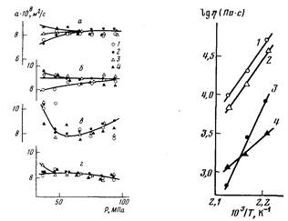 Рис. 2. Зависимость температуропроводности от давления для ИПС (а), ЦПС (б), КПС (в) и БПС (г) при 473 (1), 453 (2), 433 (3) и 413 К (4)