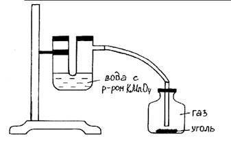 Оборудование и реактивы: Штатив с лапкой, резиновые прокладки, хлоркальциевая трубка, химический стакан, вата, слабый раствор перманганата калия или фуксина, активированный уголь.