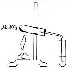 Оборудование и реактивы: Штатив с лапкой, резиновые прокладки, спиртовка, спички, пробирки, пробка со вставленной в нее газоотводной трубкой, гидрокарбонат натрия (порошок), известковая вода, шпатель.