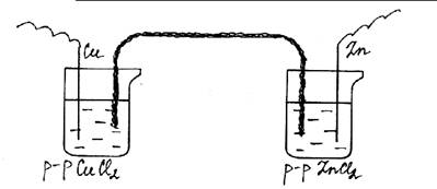 Ход работы: В один стакан наливают 10 % раствор хлорида меди, в другой – раствор хлорида цинка. В первый стакан помещают медный электрод, а во второй – цинковый. Соединяют их гальванометром. Растворы солей соединяют марлевым жгутиком, смоченным электролитом. Описать все происходящие процессы. Написать уравнения реакций.