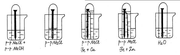 Оборудование и реактивы: 5 стаканов на 50 мл, 5 лабораторных пробирок, 5 железных гвоздей, вода дистиллированная, раствор хлорида натрия, раствор гидроксида натрия, медная и цинковая проволока.