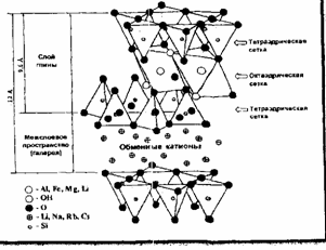 Неорганические слои глин образуют скопления с зазорами между ними, называемыми прослойками или галереями. Изоморфное замещение внутри слоев (Mg2 H замещает А13 ' в октаэдрической или А13+ замещает Si4 f в тетраэдрической структурах) генерирует отрицательные заряды, которые электростатически уравновешиваются катионами щелочных или щёлочноземельных металлов, расположенных в прослойках (рис. 1) [18]. Этим обусловлена высокая гидрофильность бентонита. При помещении бентонита в воду, она проникает в межслоевое пространство монтмориллонита, гидратирует его поверхность и обменные катионы, что вызывает набухание минерала. При дальнейшем разбавлении водой бентонит образует устойчивую вязкую суспензию с выраженными тиксотропными свойствами.