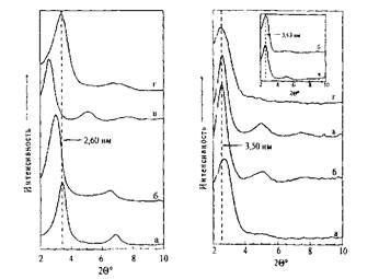 Рис. 6. Данные рентгено-структурного анализа для: I. а — диметилдиоктадециламмоний (ДМДОДА)-гекторит; б - 50 % полистирола (ПС)/50 % ДМДОДА-гекторит; в - 75 % полиэтилметакрилат (ПЭМ)/25 % ДМ ДО ДА; г - 50 % полистирол/50 % ДМДОДА-гекторит после 24 часов травления в циклогексане II. смеси полистирола, полиэтилметакрилата и органоглины: а - 23,8 % ПС/71,2 % ПЭМ/5 % ДМДОДА-гекторит; б - 21,2 % ПС/63,8 % ПЭМ/15 % ДМДОДА-гекторит; в - 18,2 % ПС/54,8 % ПЭМ/27 % ДМДОДА-гекторит; г-21,2 % ПС/63,8 % ПЭМ/15 % ДМДОДА-гекторит после 24 часов травления в циклогексане