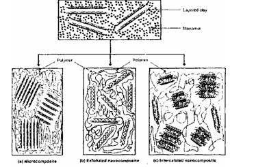 Рис. 13. Получение полимерного нанокомпозита в процессе синтеза самого полимера (insitu) (а) - микрокомпозит, (Ь) - эксфолированный (расшелушенный) нанокомпозит, (с) - интеркалированный нанокомпозит [51]