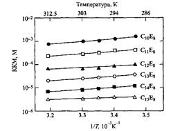 Критическая концентрация неионных полиоксиэтилированных ПАВ типа Cm En сильно зависит от числа атомов углерода в неполярной цепи и в меньшей степени от числа оксиэтиленовых групп, слабо повышаясь при увеличении длины полярной цепи. Зависимость логарифма KKM от числа атомов углерода в алкильной цепи выражается прямой, наклон которой значительно больше, чем для ионных ПАВ. Увеличение алкильной цепи на одну метиленовую группу приводит к уменьшению KKM в три раза, а не в два. Свойства неионогенных ПАВ четко коррелируют с растворимостью углеводородов в воде, что слабее выражено в случае ионных ПАВ вследствие противодействующего электростатического эффекта, который тем заметнее, чем ниже ККМ. Температурные зависимости KKM неионных ПАВ отличаются от соответствующих зависимостей для ионных ПАВ по двум признакам: зависимости более ярко выражены и обычно наблюдается монотонное снижение KKM с увеличением температуры, а не увеличение KKM при более высоких температурах.