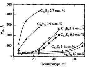 Важнейшие свойства неионных ПАВ иллюстрирует рис., где приведены зависимости гидродинамических радиусов мицелл от температуры для относительно разбавленных растворов трех НПАВ. Наблюдается незначительное или умеренное увеличение размера мицелл вплоть до высоких температур. Если НПАВ содержит более длинные оксиэтиленовые цепи, рост мицелл с температурой вообще замедляется. Для НПАВ с короткой оксиэтиленовой цепью, например С12Е5, характерен резкий рост мицелл с увеличением температуры.