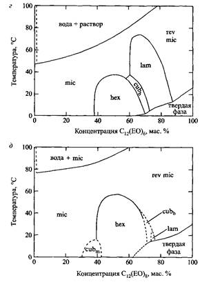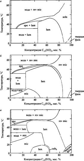 На основе анализа множества фазовых диаграмм легко выводится последовательность фазовых структур, образующихся при повышении температуры. Эта последовательность такова: сферические мицеллы, дискретная кубическая фаза, удлиненные мицеллы, гексагональная фаза, ламелярная фаза, биконтинуальная кубическая фаза, губчатая фаза и обращенные мицеллы. Некоторые структуры приведены на рис. Отметим, что повышение температуры и увеличение длины оксиэтиленовой цепи оказывают противоположные эффекты на последовательность образования фаз. Кроме того, для каждого определенного ПАВ в области доступных температур характерно образование лишь нескольких структур.