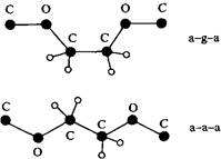 Конформации оксиэтиленовых групп, различающиеся по стабильности и полярности. Верхняя низкоэнергетическая анти-гош-анти-конформация более полярна, чем показанная внизу анти-анти-анти-конформация.