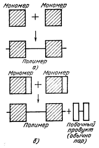| Рисунок 2 – Реакции образования полимеров: а) – полимеризация, б) - поликонденсация |