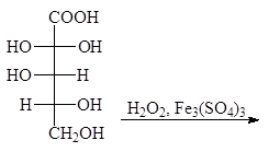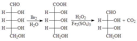 Укорочение цепи по Руфу включает две стадии: окисление альдозы бромной водой до альдоновой кислоты и окислительное декарбоксилирование альдоновой кислоты перекисью водорода и сульфатом железа до альдозы, например: