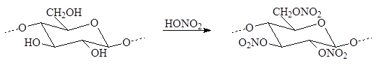 При обработке целлюлозы азотной кислотой образуется нитрат целлюлозы: