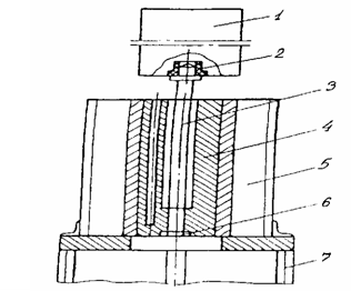 Рис. 2.2. Схема прибора для определения показателя текучести расплава полимера: 1 - груз; 2 - втулка; 3 - поршень; 4 - цилиндр; 5 - электрообогрев; 6 - сопло; 7 — подставка.