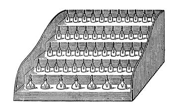 1. Переносной деревянный штатив с набором капельниц с растворами солей, реактивов, кислот и щелочей и баночек с сухими солями (рис. 1).