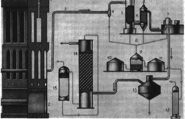 Схема коксования: 1. - коксовая батарея; 2. - сборный канал продуктов горения; 3. - газопровод; 4. - отделитель конденсата; 5. - газовый холодильник; 6. - электрофильтр; 7. - газодувка; 8. - трубопровод для отвода конденсата; 9. – отстойник; 10. – хранилище смолы; 11. – хранилище аммиачной воды; 12. – аммиачная колонна; 13. – сатуратор; 14. – бензольный скруббер; 15. – бензольная колонка.