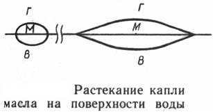Растекание . При нанесении на поверхность воды капли нерастворимой в ней жидкости в одних случаях происходит растекание капли, в других оно отсутствует. Явление растекания обусловливается поверхностным натяжение на трех поверхностях раздела: вода-воздух (s вг), вода-капля (s вм) и капля-воздух (s мг).