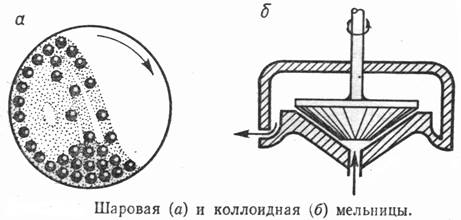 Для получения грубодисперсных систем служат шаровые мельницы (см. рис. 3), представляющие собой полые, вращающиеся цилиндры, содержащие некотрое количество стальных или керамических шаров. При вращении цилиндра эти шары перекатываются, дробя и истирая измельчаемый материал. В шаровых мельницах получают порошки, цемент, густотертые краски и т.п.; размер частиц дисперсной фазы в них можно довести лишь до 1000 нм. Для более тонкого измельчения — до 100 нм и меньше — используют коллоидные мельницы , в которых измельчаемый материал (грубая суспензия), проходя через зазор между вращающимся ротором и корпусом мельницы, подвергается дальнейшему измельчению. В коллоидных мельницах получают акварельные краски, пудру, лекарственные препараты и т.п.