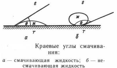 Количественной мерой процесса смачивания может служить угол, образованный каплей и твердой поверхностью. Этот угол наывают краевым углом смачивани