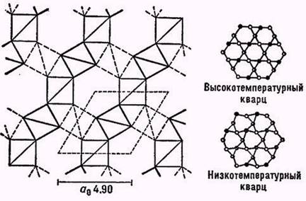 Кварц (нем. Quarz), минерал; под названием К. известны две кристаллической модификации двуокиси кремния SiO2 : гексагональный К. (или a-К.), устойчивый при давлении в 1 атм (или 100 кн/м2 ) в интервале температур 870—573 °С, и тригональный (b-К.), устойчивый при температуре ниже 573 °С. b-К. наиболее широко встречается в природе. Он кристаллизуется в классе тригонального трапецоэдра тригональной системы. Кристаллическая структура каркасного типа построена из кремне-кислородных тетраэдров, расположенных винтообразно (с правым или левым ходом винта) по отношению к главной оси кристалла. В зависимости от этого различают правые и левые структурно-морфологические формы кристаллов, различающиеся внешне по симметрии расположения некоторых граней (например, трапецоэдра и др.). Отсутствие плоскостей и центра симметрии у кристаллов К. обусловливает наличие пьезоэлектрических и пироэлектрических свойств.
