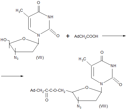 Японские исследователи разработали метод синтеза производных 3`-азидо-3`-дезокситимидина содержащих фрагмент адамантана в положении 5`-нуклеозида. Изучение биологического действия сложного эфира (VIII), полученного из азидотимидина (VII) и (1-адамантил)-уксусной кислоты, показало, что его концентрация в паренхиматозной ткани головного мозга в 18 раз превышает величину, полученную в сравнительном эксперименте с 3`-азидо-3`-дезокситимидином. Следовательно, введение фрагмента адамантана в 3`-азидо-3`-дезокситимидин облегчает транспорт этого лекарственного средства в ткани головного мозга, куда проникает вирус СПИДа и поражает центральную нервную систему.