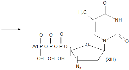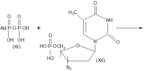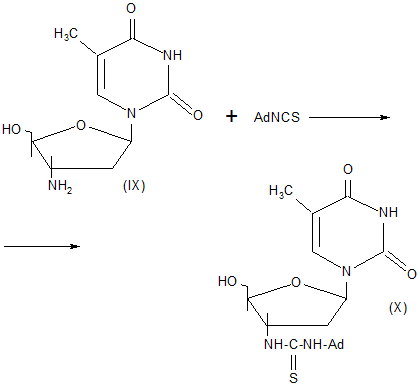 С целью поиска новых антиспидовых препаратов осуществлен синтез 3`-(1-адамантил) тиоуреидопроизводного тимидина (Х) взаимодействием 3`-аминотимидина (IX) с (1-адамантилфосфонил) фосфата (XI) с монофосфатом азидотимидина (XII) [3].