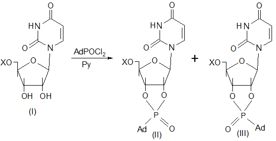 Аналогичные соединения образовывались при взаимодействии 5`-о-ацетилуридина и 5`-фтор-5`-дезоксиуридина с дихлорангидридом 1-адамантилфосфоновой кислоты. Однако реакция с 2`,3`-о-изопропилиденуридином в этих же условиях не пошла [25]. Смесь диастереомерных по фосфору соединений получается также при взаимодействии 5-бром-, 5-фтор-, 6-азауридина или их 5`-о-производных с дихлорангидридом 1-адамантилфосфоновой кислоты [26].
