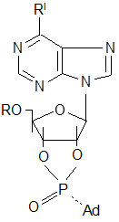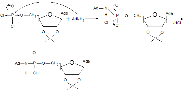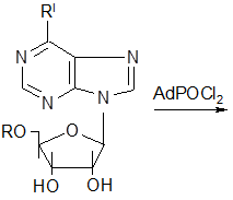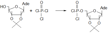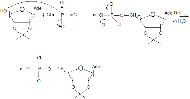 Синтез 5`-р-(дихлор)-2`,3`-о-изопропилиденаденозинмонофосфата осуществлялся взаимодействием 2`,3`-о-изопропилиденаденозина с треххлорокисью фосфора в присутствии водного раствора гидроксида аммония по следующей схеме: