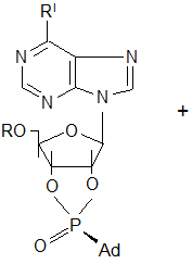 При взаимодействии дихлорангидрида 1-адамантилфосфоновой кислоты с пуриновыми основаниями получается многокомпонентная смесь с большим содержанием исходного нуклеозида. Однако реакция идет по той же схеме с образованием диастереомерных соединений: