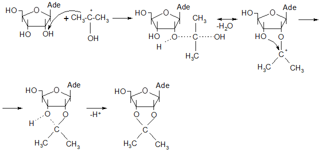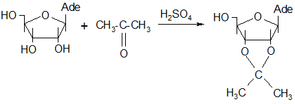 Синтез 2`,3`-о-изопропилиденаденозина осуществлялся взаимодействием аденозина с ацетоном в среде абсолютного ацетона при постоянном перемешивании. Схема этой реакции такова: