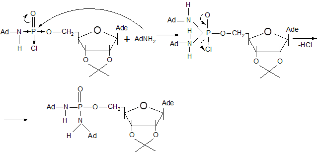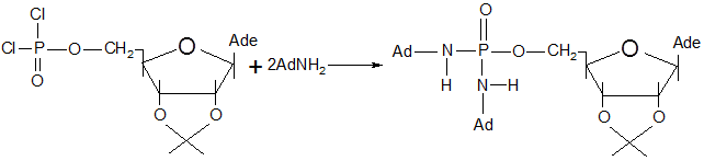 Синтез 5`-р-(диаминоадамантил)- 2`,3`-о-изопропилиденаденозинмоно-фосфата осуществлялся взаимодействием аминоадамантана с 5`-р-(дихлор)-2`,3`-о-изопропилиденаденозинмонофосфатом. Схема этой реакции такова: