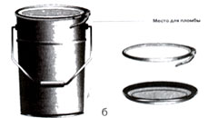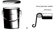 б - ведро с накладываемой крышкой, оснащенной кольцевым замком с рычажным зажимом;