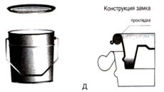 д - ведро с вдавливаемой крышкой, застрахованной от выпадания специальными устройствами. Дно трижды завальцовано