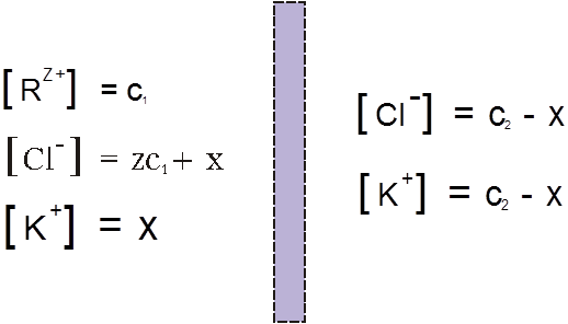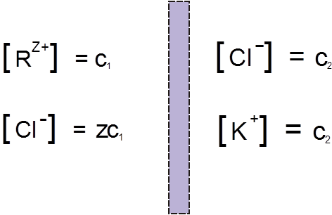 В левой части сосуда, разделенного полупроницаемой мембраной, находится раствор полимера, который в результате диссоциации представлен поликатионом R(Z+) и противоионом Cl– , концентрации которых равны соответственно C1 и ZC1 . В левой части – раствор низкомолекулярного электролита, например KCl, с концентрацией С2 , диссоциирующий на К+ и Cl– . При установлении равновесия вследствие диффузии в такой системе малые ионы K+ перемещаются преимущественно из правой части сосуда в левую. Макрокатионы R(Z+) не могут проникать через мембрану, поэтому для сохранения электронейтральности вместе с катионами K+ справа налево происходит перемещение избыточного числа анионов Cl– . В результате этих процессов концентрация низкомолекулярного электролита в растворе ВМС повышается: