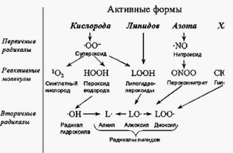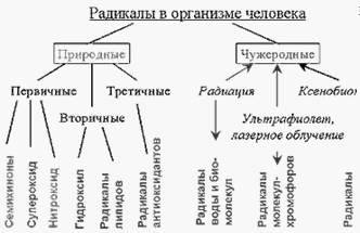 Все радикалы, образующиеся в человеческом организме, можно разделить на природные и чужеродные. В свою очередь природные радикалы можно разделить на первичные, вторичные и третичные (См. схему на рис. 4).