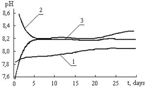 Рис. 2.1. Изменение рН в пробах речной воды: 1 — речная вода без воздействий, 2 — кипяченая речная вода, 3 — кипяченая речная вода с добавлением ![]()