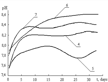 Основные этапы круговорота биогенных элементов в водной среде — разложение и синтез органического вещества сопровождаются сдвигом углекислотного равновесия, что приводит к изменению рН среды. Поэтому обобщенным показателем динамики неравновесных процессов в воде в проведенных исследованиях выбрано изменение значений водородного показателя. Измерения рН осуществлялись при помощи ионометра И-130М при комнатной температуре. Основные опыты были проведены на воде из р.Волхов, а также на модельных растворах (200 мг/л