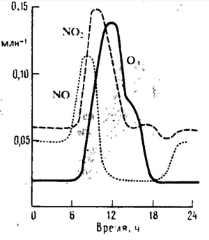 Таким образом в воздухе накапливается озон и гидроксорадикал, Причем скорость образования О3 зависит от содержания в атмосфере NO – она тем больше чем выше концентрация NO