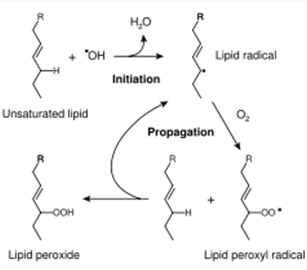 Как показал Б.Н. Тарусов (1954), механизм свободнорадикального окисления липидов в тканях и мембранах соответствует общим законам ценного окисления. Процесс цепного окисления начинается со стадии инициирования, причем в роли инициатора может выступать ОН-радикал, способный отнимать атом водорода у органических соединений (RH) с образованием воды и активного органического свободного радикала, участвующего в цепи последующих реакции.