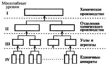 В структуре ХТС минимальный элемент – отдельный аппарат (реактор, абсорбер, ректификационная колонна, насос и прочее). Это – низший масштабный уровень I. Несколько аппаратов, выполняющих вместе какое-то преобразование потока, – элементы подсистемы II масштабного уровня (реакционный узел, система разделения многокомпонентной смеси и т.д.). Совокупность подсистем второго уровня как элементы образуют подсистему III уровня (отделения или участки производства, например в производстве серной кислоты – отделения обжига серосодержащего сырья, очистки и осушки сернистого газа, контактное, абсорбционное, очистки отходящих газов). К этим же подсистемам могут относиться водоподготовка, регенерация отработанных вспомогательных материалов, утилизация отходов. Совокупность отделений, участков образует ХТС производства в целом. Описанное выделение подсистем условно. В каких-то задачах выделение подсистем, элементов может быть иным.