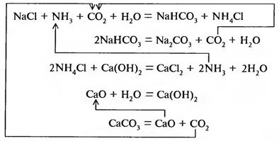 Последовательность химических взаимодействий удобно представить и такой схемой, как, например, производство соды Nа2 СОз из поваренной соли NaClи известняка СаС03 :