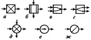 Технологические операторы: а – химического превращения; б – массообмена; в-смешения; г – разделения; д – теплообмена; е – сжатия, расширения; ж – изменения агрегатного состояния