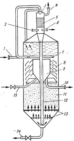 15 - сброс дренажной воды; 12 - центральная подающая труба; 13 - ложные перфорированные днища; 11 - взвешенный слой; 14 - сброс шлама; 9 - сборник умягченной воды; 1, 10 - подача исходной и отвод умягченной воды; 2 - продувка котлов; 3 - эжектор; 4 - выпар; 5 - пленочный подогреватель; 6 - сброс пара; 7 - кольцевой перфорированный трубопровод отвода воды к эжектору; 8 - наклонные сепарирующие перегородки