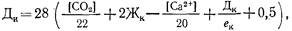 где [СО2 ] - концентрация в воде свободного оксида углерода (IV), мг/л; [Са2+ ] - концентрация ионов кальция, мг/л; Жк - карбонатная жесткость воды, мг-экв/л; Дк - доза коагулянта (FeS04 или FeCl3 в пересчете на безводные продукты), мг/л; ек - эквивалентная масса активного вещества коагулянта, мг/мг-экв (для FeS04 е к = 76, для FeCl3 ек = 54); 0,5 и 0,3 - избыток извести для обеспечения большей полноты реакции, мг-экв/л.
