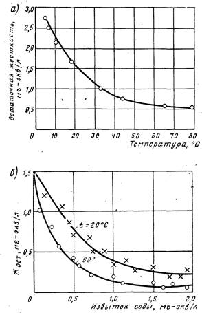 Из графика (рис. 2, а) видно, что остаточная жесткость, близкая к теоретически возможной, может быть получена только при значительном подогреве воды. Значительный эффект умягчения наблюдается при 35.40°С, дальнейший подогрев менее эффективен. Глубокое умягчение ведут при температуре выше 100° С. Большой избыток реагента-осадителя при декарбонизации добавлять не рекомендуется, так как возрастает остаточная жесткость из-за непрореагировавшей извести или при наличии в воде магниевой некарбонатной жесткости вследствие ее перехода в кальциевую жесткость: