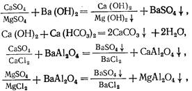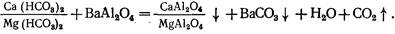 Бариевый метод умягчения воды применяют в сочетании с другими методами. Вначале вводят барий содержащие реагенты в воду (Ва (ОН) 2 , ВаСО3 , ВаА12 04 ) для устранения сульфатной жесткости, затем после осветления воды ее обрабатывают известью и содой для доумягчения. Химизм процесса описывается реакциями:
