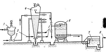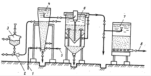 Рис. 5. Установка нзвестково-содового умягчения воды.1,8 - подача исходной и отвод умягченной воды; 2 - эжектор; 3 - бункер с контактной массой; 5 ввод реагентов; 6 - осветлитель со слоем взвешенного осадка; 7 - осветлительный скорый фильтр; 4 - вихревой реактор
